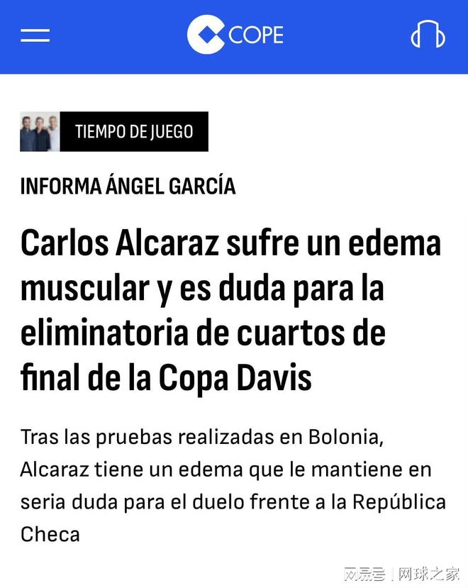 “我感觉到腿筋有些不适,但说实话它没有太大影响我的发挥,我仍然能很好地跑动和击球。”在ATP年终总决赛败给辛纳后,阿尔卡拉斯在新闻发布会上轻描淡写地描述了他的腿伤情况。 尽管语气轻松,这位22岁的世界第一还是按照计划在抵达博洛尼亚后接受了核磁共振检查。检查结果却不容乐观——他的腿筋部位出现了肌肉水肿。医疗团队发出严厉警告:如果他坚持参加戴维斯杯,肌肉撕裂的风险极高。
