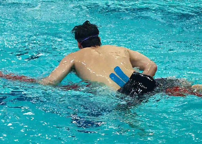 新华社 图 第二帧:夺冠后,汪顺准备跨上水线向现场观众示意,他腰上贴着的两条厚肌贴十分明显。