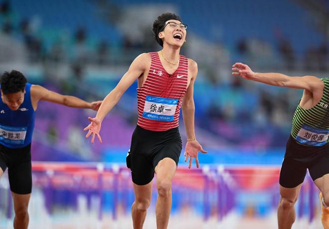 徐卓一获得全运会男子110米栏金牌。 跑出属于自己的节奏 当下的中国男子110米栏,上海队的徐卓一、陈圆将和江苏队的刘俊茜都被视为最有力的金牌争夺者。在这一届全运会上,三人也同时跻身决赛。 “和他们一起进入到最后的决赛,多少都会有一点压力。”徐卓一直言,而最后,他成了跑得最快的那一个,以13秒12的成绩刷新个人最好成绩,领先刘俊茜0.02秒夺得金牌。 而陈圆将则出现了失误,无缘奖牌,“第二个栏敲栏了,而且敲得非常严重,整个人的重心都没有了。” “未来的目标还是先把自己的技术动作稳定住,尽量不要像今天这样低级失误,其实是可以跑一个很不错的成绩的,但是因为失误,没有做到。” 不过,虽然自己的发挥不尽如人意,对于同队师哥的夺冠,他还是非常开心,“我们都为他感到高兴,因为这对于我们上海队来说,已经不仅仅是个人荣誉了。” 在这一天的赛道上,徐卓一完全找到了属于自己的节奏,比赛进程相当“丝滑”。赛后他透露了自己的战术,就是前程跟住主要对手刘俊茜,“然后在后程越栏的时候跑出自己的节奏和水平就可以。” 而比赛的场景,也的确如他的计划。教练孙海平直言,“其实在第五个栏我知道(金牌)已经有了,因为我们的特长就是后程,刘俊茜前程确实非常快,但是并没有快到徐卓一赶不上的程度。”