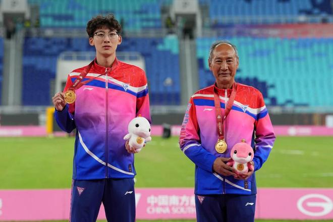 徐卓一和孙海平一起站上领奖台。 全运会九连冠的传承 这一枚金牌,对于徐卓一个人而言是宝贵的收获,对于上海跨栏而言,更是荣耀的延续。 “从陈指导(陈雁浩)到翔哥(刘翔),到骏哥(谢文骏),再到现在的我,今年是第九冠,我拿下了。” 早在1993年的第七届全运会上,陈雁浩就曾为上海夺得男子110米栏冠军,并随后在第八届全运会实现卫冕,从此之后,一代代跨栏名将接过了接力棒。 第九届、第十届和第十一届全运会,中国跨栏传奇刘翔用三连冠延续了荣耀。此后,刘翔的师弟谢文骏扛起了大旗,复刻了刘翔全运会三连冠的壮举。 这一届全运会,已是老将的谢文骏依然站上了赛道,只是受伤病困扰的他未能从预赛突围,就此结束了自己的全运会生涯。 但上海跨栏的辉煌履历,已经在后辈的手中得到了续写。赛后,徐卓一也坦言这枚金牌对自己意义重大。 “我2023年的时候把亚运会(跨栏项目)的第十块金牌丢了,今年不能再把上海(在全运会跨栏项目)的第九块金牌给丢掉,因此收获金牌之后,自己特别开心。”
