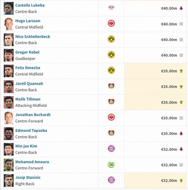 奥利塞(拜仁)涨幅:3000万欧 身价:1.3亿欧 詹-乌尊(法兰克福)涨幅:2700万欧 身价:4500万欧 伦纳特-卡尔(拜仁)涨幅:1850万欧 身价:2000万欧 扬-迪奥曼德(RB莱比锡)涨幅:1850万欧 身价:2000万欧 阿德耶米(多特蒙德)涨幅:1500万欧 身价:6000万欧 夸安萨(勒沃库森)涨幅:1500万欧 身价:3500万欧 赛义德-马拉(科隆)涨幅:1500万欧 身价:1800万欧 埃塞基耶尔-费尔南德斯(勒沃库森)涨幅:1300万欧 身价:2500万欧 罗慕洛(RB莱比锡)涨幅:1100万欧 身价:2200万欧 于帕梅卡诺(拜仁)涨幅:1000万欧 身价:6000万欧 |