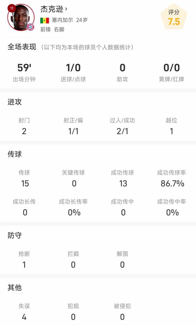 雷速体育11月2日讯 北京时间今天凌晨,拜仁在德甲比赛中3-0大胜勒沃库森,杰克逊本场比赛出场59分钟,比赛第32分钟打入1球。 统计显示,杰克逊本场比赛2次射门,1次射正,打入1球。他2次过人1次成功。 比赛中他1次越位。15次传球13次成功。 防守层面,他贡献了1次抢断。 在比赛中,他4次失误。    |