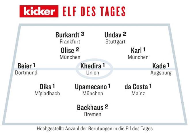 守门员:巴克豪斯(不莱梅) 后卫:迪克斯(门兴)、于帕梅卡诺(拜仁)、丹尼-达科斯塔(美因茨) 中场:拜尔(多特)、拉尼-赫迪拉(柏林联合)、安东-卡德(奥格斯堡)、奥利塞(拜仁)、伦纳特-卡尔(拜仁) 前锋:伯卡特(法兰克福)、昂达夫(斯图加特) |