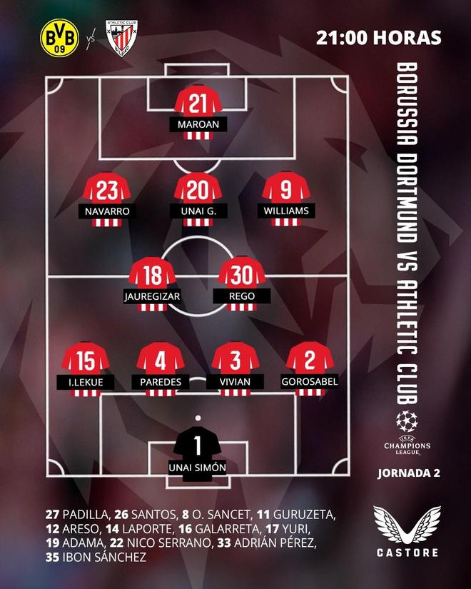 北京时间10月2日03:00,欧冠 联赛阶段 第2轮,多特蒙德主场迎战毕尔巴鄂竞技,赛前双方球队首发名单公布如下: