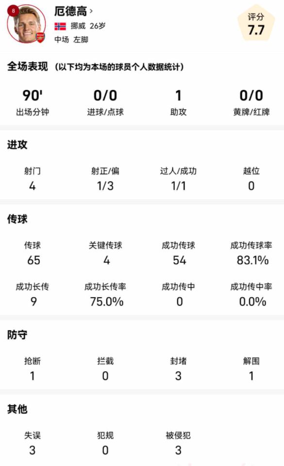 厄德高本场比赛贡献4次射门,1次成功过人;65次传球。4次关键传球,1次助攻,传球成功率83.1%。防守方面还贡献了1次抢断3次封堵和1次解围。
