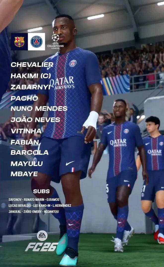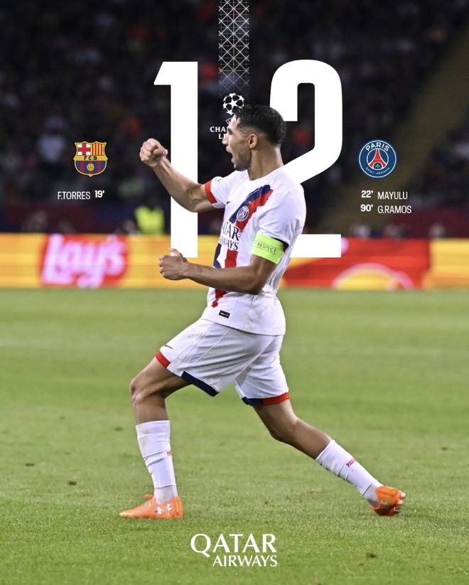 首发名单 北京时间10月2日凌晨3:00,欧冠联赛阶段第2轮,大巴黎客场对阵巴塞罗那。争取小组赛两连胜,继续欧冠征程! 上半场 第19分钟,由巴塞罗那费兰·托雷斯率先取得进球。 第38分钟,大巴黎扳平比分!努诺·门德斯连过数人送出精彩助攻,马尤卢推射破门比分来到1:1! 半场结束,球队暂时1:1巴塞罗那。 下半场 第80分钟,巴萨配合失误,替补上场的李刚仁突破打门击中立柱,巴萨逃过一劫! 第90分钟,绝杀!贡萨洛·拉莫斯接到阿什拉夫助攻,门前冷静推射!比分最终定格在巴黎2:1巴萨! 最终,巴黎在客场1:2战胜巴塞罗那,取得欧冠两连胜!! |