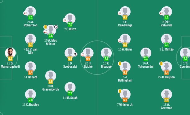 【出场阵容】 利物浦首发:25-马马尔达什维利、12-布拉德利、4-范戴克、5-科纳特、26-罗伯逊(886-科尔克兹)、38-赫拉芬贝赫、8-索博斯洛伊、10-麦卡利斯特(69'17-琼斯)、11-萨拉赫、22-埃基蒂克(69'18-加克波)、7-维尔茨(88'14-基耶萨) 替补未出场:28-伍德曼、74-米斯丘尔、2-戈麦斯、3-远藤航、73-恩古莫哈 皇马首发:1-库尔图瓦、8-巴尔韦德(90'21-迪亚斯)、3-米利唐、24-赫伊森、18-卡雷拉斯、14-楚阿梅尼、6-卡马文加(69'11-罗德里戈)、15-居莱尔(81'12-阿诺德)、5-贝林厄姆、7-维尼修斯、10-姆巴佩 替补未出场:13-卢宁、26-弗兰-冈萨雷斯、9-恩德里克、16-贡萨洛、17-阿森西奥、19-塞瓦略斯、20-弗兰-加西亚、23-费兰-门迪 |