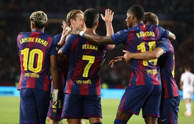 本场比赛,巴萨派出首发的阵容:25-什琴斯尼、3-巴尔德、4-阿劳霍、23-孔德、24-埃里克·加西亚、16-费尔明、17-卡萨多、21-德容、7-费兰、10-亚马尔、14-拉什福德 开场不到20分钟,两队打进三球,场面疯狂对攻。