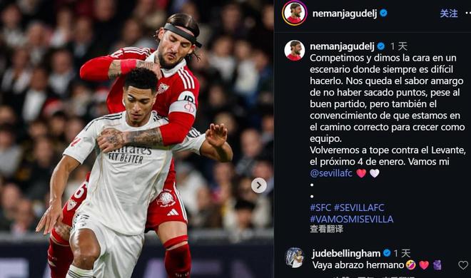 塞维利亚中场古德利近日在社交媒体分享了客场对阵皇家马德里时的比赛照片,并配文表达了球队虽表现出色却未能取分的遗憾与对未来的信心。皇马中场贝林厄姆在评论区幽默留言称:“哇,好用力地拥抱啊,兄弟!”