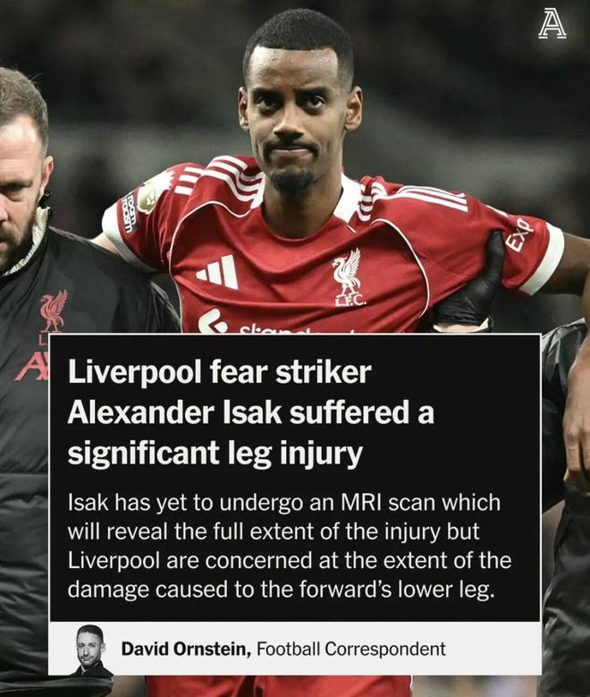 据悉,伊萨克在半场时替换布拉德利登场,并在第56分钟接维尔茨传球,帮助球队破门,但同时,他被对手滑铲地放倒,无法与队友一同庆祝。 随后,伊萨克接受了治疗,并由两名利物浦医疗人员搀扶离场,弗林蓬替换他上场。伊萨克尚未接受核磁共振扫描以明确伤势的全部情况,但利物浦对这名前锋小腿的受损程度感到担忧。