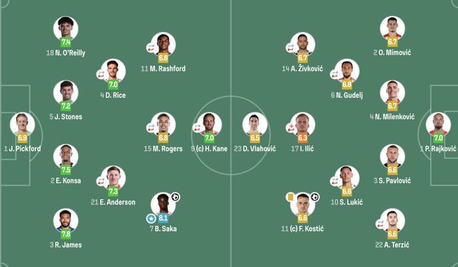 英格兰(4231):1-皮克福德;3-里斯-詹姆斯,2-孔萨,5-斯通斯,18-奥赖利;4-赖斯(65‘8-亨德森),21-安德森;7-萨卡,15-罗杰斯(65‘10-贝林厄姆),11-拉什福德(64‘19-埃泽);9-凯恩(65‘17-福登) 塞尔维亚(4231):1-拉伊科维奇;2-米莫维奇,4-米伦科维奇,3-帕夫洛维奇,22-特尔季齐;6-古德利,10-卢基奇;14-日夫科维奇,17-伊利奇,11-科斯蒂奇;23-弗拉霍维奇 |