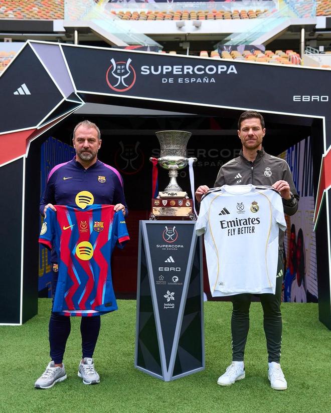 2026年西班牙超级杯决赛前,作为传统环节之一,巴塞罗那主帅弗里克和皇家马德里主帅哈维-阿隆索在奖杯前合影。