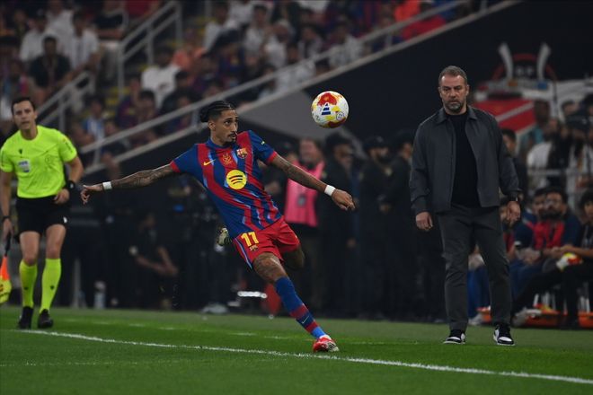 上半场,双方针尖对麦芒,各不相让。比赛在尾声阶段掀起狂潮:第36分钟,拉菲尼亚带球突入禁区左侧低射死角得手;第45+2分钟,维尼修斯穿裆过人后倒地扫射扳平;第45+4分钟,莱万接佩德里直塞禁区内挑射再度领先;第45+6分钟,贡萨洛角球混战中头球中柱入网再度扳平。 金花四溅的2比2,精彩绝伦的上半场,这场西班牙超级杯决赛踢出了有史以来最佳表现,但到了下半场,比赛的天平终究还是倒向了卫冕的巴萨。