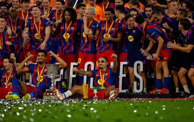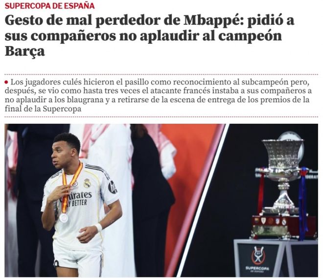 1月12日。巴萨在西超杯决赛3比2击败皇马夺冠,下半场还被红牌罚掉德容,但不妨碍他们坚挺到最后。巴萨这场比赛还一如既往被裁判亏待,但在纸面阵容并没有绝对占优的情况下,依旧笑到最后,拉菲尼亚和加西亚在攻防两端撑场面,莱万也进球并激活两个里程碑——榜首都是梅西、历史第一。 赛后,向来打造高情商人设并且在发言和采访中确实符合形象的姆巴佩,却憋不住了,他开始小气起来,可能是被巴萨多次击败带来的后遗症,居然小气阻止皇马按照惯例祝贺巴萨夺冠。