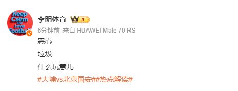 媒体人陆洋表示,“真要帮香港同胞创个纪录么?貌似亚洲赛场香港球队主力打主力还没在咱身上开过张,今天这半小时各种猛送。”博主李明体育更是表示“恶心、垃圾”。 博主卖萌谁在行则嘲讽道,“塞蒂恩下课的时候,国安可是通过媒体一直强调怎么怎么重视亚冠。把亚冠上替补客场输球,称之为决定塞蒂恩下课的最后一击。我这半场结束前打开直播,国安怎么还在落后。” |