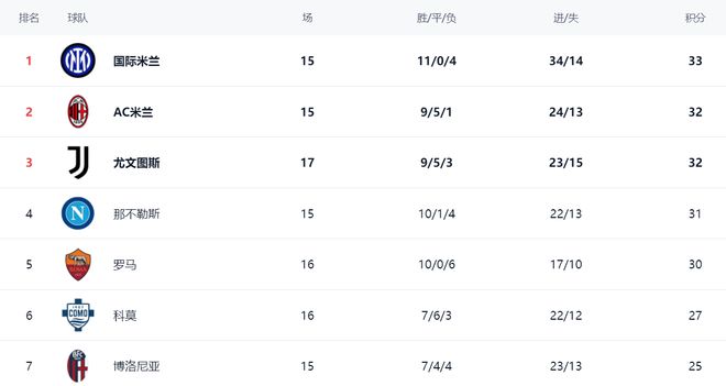 在积分榜上,国际米兰以33分高居榜首。不过,国际米兰的领先优势很少。AC米兰拿到32分,排第2,只落后1分。尤文图斯赢球之后,暂时升到第2名,也是32分。不过,尤文图斯踢了17场联赛,比米兰双雄都要多踢2场。那不勒斯总积分是31分,排名掉到第4。罗马以30分排名第5。前5的球队差距最多只有3分,冠军的争夺真是太激烈了。科莫以27分排名第6。博洛尼亚25分排名第7。 |