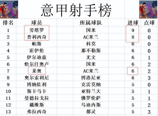 射手榜方面,劳塔罗9球继续领跑,普利西奇未能把握住机会破门,还是1球之差排在第2。莱奥打入制胜球,追上伊尔迪兹,恰尔汗奥卢和奥尔索利尼,4人6球并列第3。 |