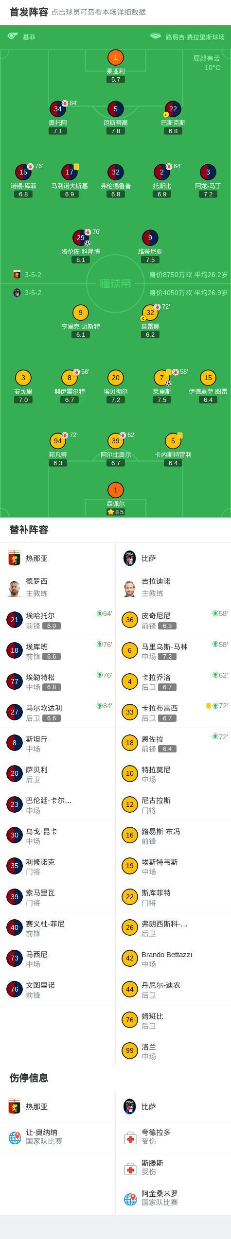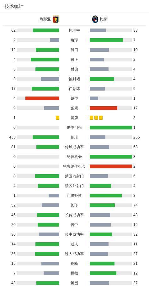 第15分钟,热那亚球员洛伦佐-科隆博打入一球。 第38分钟,比萨球员莱里斯打入一球。 球队阵容 技术统计 |