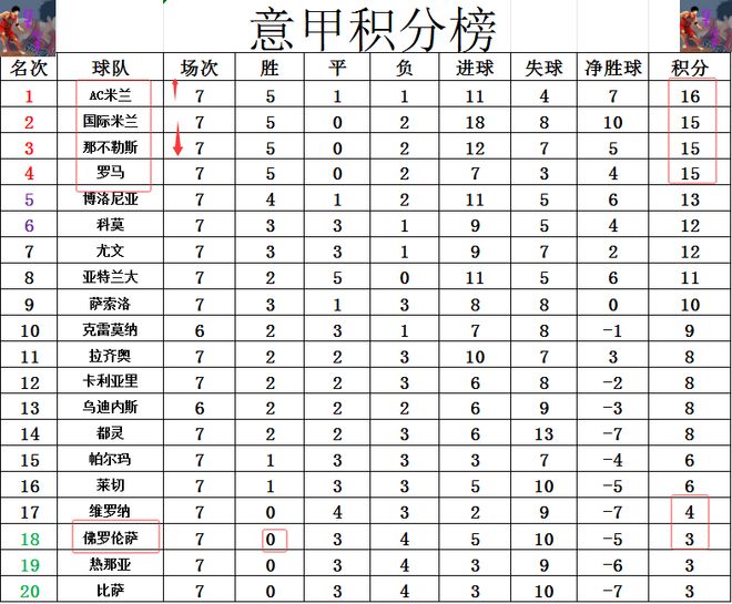 意甲最新积分战报AC米兰逆转绝杀超国米登顶尤文4轮不胜跌到第7