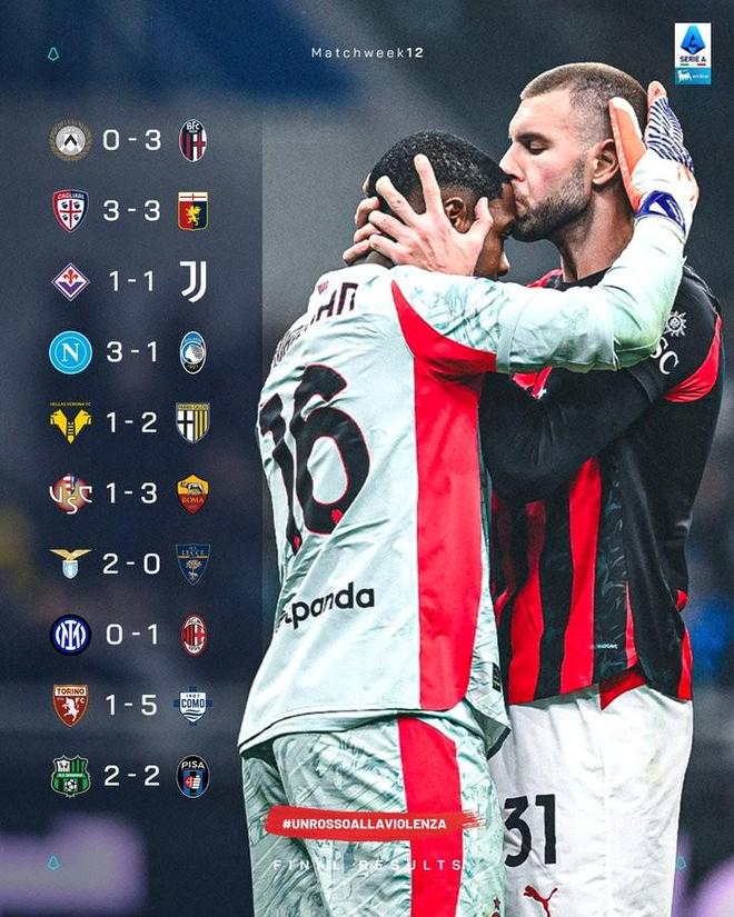 卡利亚里3-3热那亚 乌迪内斯0-3博洛尼亚 佛罗伦萨1-1尤文图斯 那不勒斯3-1亚特兰大 维罗纳1-2帕尔马 克雷莫内塞1-3罗马 拉齐奥2-0莱切 国际米兰0-1AC米兰 都灵1-5科莫 萨索洛2-2比萨 |