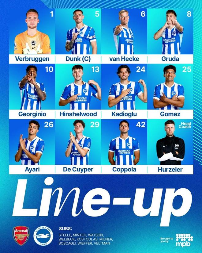 阿森纳首发:1-拉亚、2-萨利巴、5-因卡皮耶、33-卡拉菲奥里、36-苏比门迪、41-赖斯、23-梅里诺、8-厄德高、7-萨卡、19-特罗萨德、14-哲凯赖什 替补:13-凯帕、6-加布里埃尔、9-热苏斯、10-埃泽、11-马丁内利、16-内尔高、20-马杜埃凯、22-恩瓦内里、49-刘易斯-斯凯利 布莱顿首发:1-费布鲁亨、29-德克伊珀、5-邓克、6-范黑克、24-卡迪奥卢、42-科波拉、13-欣谢尔伍德、8-格鲁达、25-迭戈-戈麦斯、26-阿亚里、10-吕特 替补:23-斯蒂尔、11-明特、14-汤姆-沃森、18-维尔贝克、19-科斯图拉斯、20-米尔纳、21-博斯卡利、27-魏费尔、34-费尔特曼