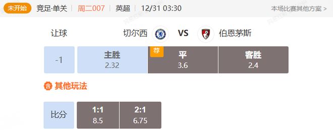 2.专家:李大利 竞足 周二007英超切尔西VS伯恩茅斯 开赛时间:2025-12-31 03:30:00