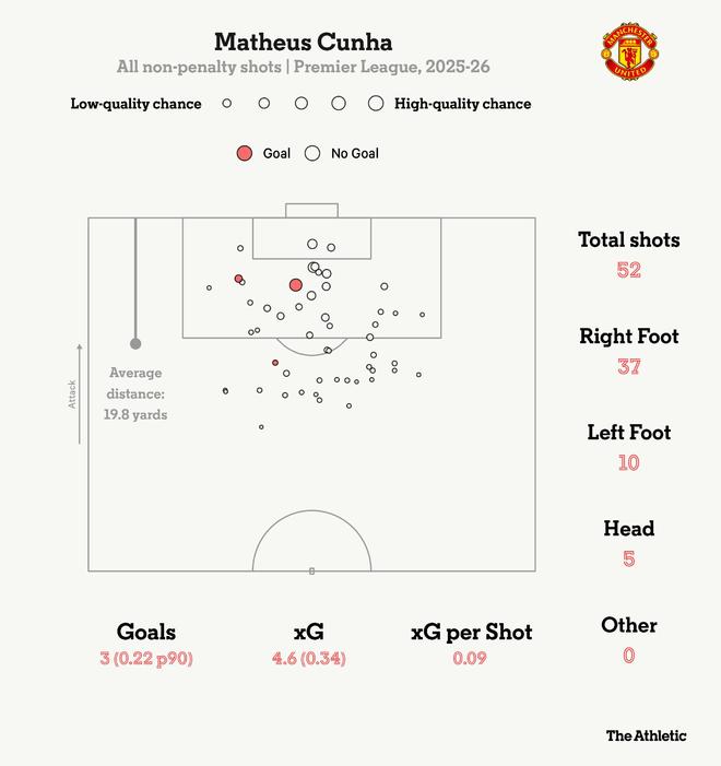 正如去年夏天所指出的那样,库尼亚是上赛季xG超额完成最明显的球员之一,这样的效率不太可能在老特拉福德持续。目前,库尼亚保持了2024-25赛季的射门频率,但进球运气有所下降。回顾他上赛季的射门分布,他既有远射,也有在点球区与六码区之间完成的机会。在加盟曼联的首个赛季进行到一半时,这些行为模式仍在出现,但成功率有所降低。