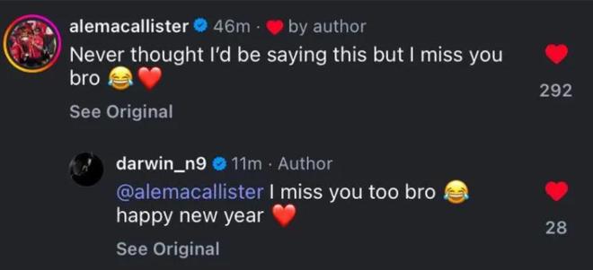 结束2025年后,努涅斯在社交媒体上上晒图回顾这一年,而他的前队友麦卡利斯特则在评论区表示想他了。