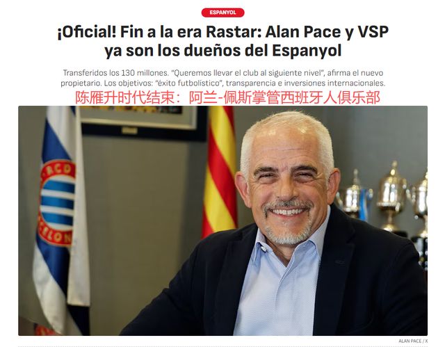 西班牙人的中资时代,正式结束。北京时间10月9日,西甲俱乐部西班牙人官方宣布,阿兰-佩斯的ALK资本旗下体育投资部门VSP,完成对西班牙人俱乐部股权的收购。陈雁升以1.3亿欧元的价格出售西班牙人俱乐部,其中6500万欧元(折合人民币5.4亿元)的现金支付已经到账。 这则通告,意味着55岁的陈雁升不再担任西班牙人俱乐部主席,西班牙人的10年中资俱乐部身份,已经画上句号。 2015年11月,陈雁升的星辉娱乐宣布,获得西班牙人50.1%的股权,成为俱乐部最大股东。2016年,陈雁升再砸4000万欧元,持股比例达到99.35%。2021年7月,陈雁升持有西班牙人的股份达到99.6%。 西班牙人一度是中国球迷的主队。2019年1月,武磊加盟西班牙人,引发西甲和中国足坛的轰动。在西班牙人3年半,武磊126次出场,打进16球。2022年夏天,武磊离开西班牙人,重返上海海港,西班牙人在国内的热度也随之下降。 根据此前的公告,西班牙人俱乐部的转让价为1.3亿欧元。《阿斯报》透露,10月9日,西班牙人俱乐部所有转让程序走完,周四早上,VSP将6500万欧元(折合人民币5.4亿元)的资金打到星辉娱乐的账户。剩余的6500万欧元,将以股份方式进行支付,星辉体育得到2500万欧元的买方股份,星辉游戏收取4000万欧元的买方股份。 西班牙人俱乐部的新老板阿兰-佩斯,英超球迷不会陌生。 阿兰-佩斯出生于1968年,美国商人。入主西班牙人俱乐部之前,阿兰-佩斯就有一家英超俱乐部——伯恩利。2020年12月,阿兰-佩斯的ALK资本,以1.7亿英镑的价格,收购伯恩利84%的股份。本赛季英超,伯恩利7场拿到4分,排名第18位,保级压力不小。 回顾陈雁升执掌西班牙人的10年,有短暂的辉煌,更多的是低迷。当初入主西班牙人时,陈雁升豪言“3年之内杀进欧冠”,已然成为笑柄。西班牙人不仅没有杀进欧冠,还有2次降级。陈雁升更是当起甩手掌柜,有足足3年时间没有亲临现场督战,这让球迷非常不满。 |