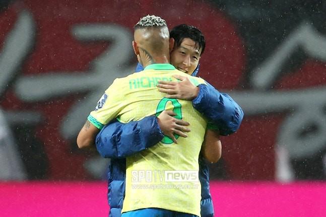 老友相见,巴西大胜韩国赛后,里沙利松与孙兴慜交谈并拥抱