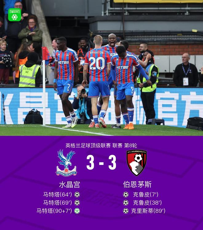 北京时间10月18日英格兰足球顶级联赛 联赛 第8轮,水晶宫主场对阵伯恩茅斯。水晶宫马特塔帽子戏法。伯恩茅斯 克鲁皮梅开二度,克里斯蒂破门。最终比分水晶宫 3-3 伯恩茅斯。 关键事件 第7分钟,克鲁皮头球破门先拔头筹,伯恩茅斯1-0 上咪咕独家看英超 第38分钟,克鲁皮补射破门完成双响,伯恩茅斯2-0水晶宫 上咪咕独家看英超 第64分钟,右路横传门前,马特塔中路推射破门扳回一分,水晶宫1-2 上咪咕独家看英超 第69分钟,马特塔后点铲射破门完成双响,水晶宫2-2 上咪咕独家看英超 第89分钟,塔韦尼耶底线传中,克里斯蒂破门,伯恩茅斯3-2水晶宫 上咪咕独家看英超 第90+7分钟,格伊造点,马特塔主罚点球命中,水晶宫3-0伯恩茅斯