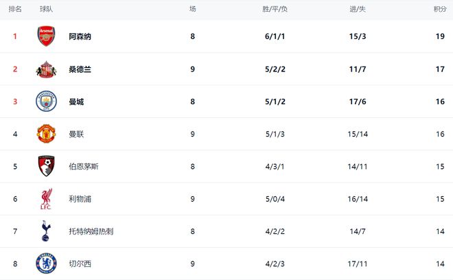 在积分榜上,阿森纳以19分高居榜首。桑德兰这匹大黑马升到了第2名,总积分是17分。第3的是曼城,拿到16分。曼城比桑德兰少踢1场。曼联赢球之后,排名升到了第4,积分和曼城相同。而利物浦依然是15个积分,掉到了第5名。伯恩茅斯以15分排名第6。第7的是热刺,拿到14分。切尔西也是14分,排名第8。 |