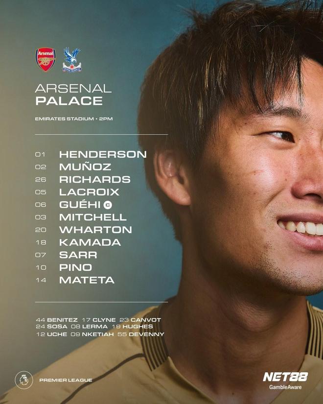 阿森纳首发:1-拉亚、12-廷贝尔、2-萨利巴、6-加布里埃尔、33-卡拉菲奥里、41-赖斯、36-苏比门迪、10-埃泽、7-萨卡、19-特罗萨德、14-哲凯赖什 替补:3-莫斯克拉、4-本-怀特、5-因卡皮耶、11-马丁内利、13-凯帕、16-内尔高、22-恩瓦内里、23-梅里诺、49-刘易斯-斯凯利 水晶宫首发:1-迪恩-亨德森、2-穆尼奥斯、26-克里斯-理查兹、5-拉克鲁瓦、6-格伊、3-米切尔、20-亚当-沃顿、18-镰田大地、7-伊斯梅拉-萨尔、10-耶雷米-皮诺、14-马特塔 替补:8-莱尔马、9-恩凯蒂亚、12-克里桑图斯-乌切、17-克莱因、19-威尔-休斯、23-康沃、24- 索萨、44-瓦尔特-贝尼特斯、55-德文尼