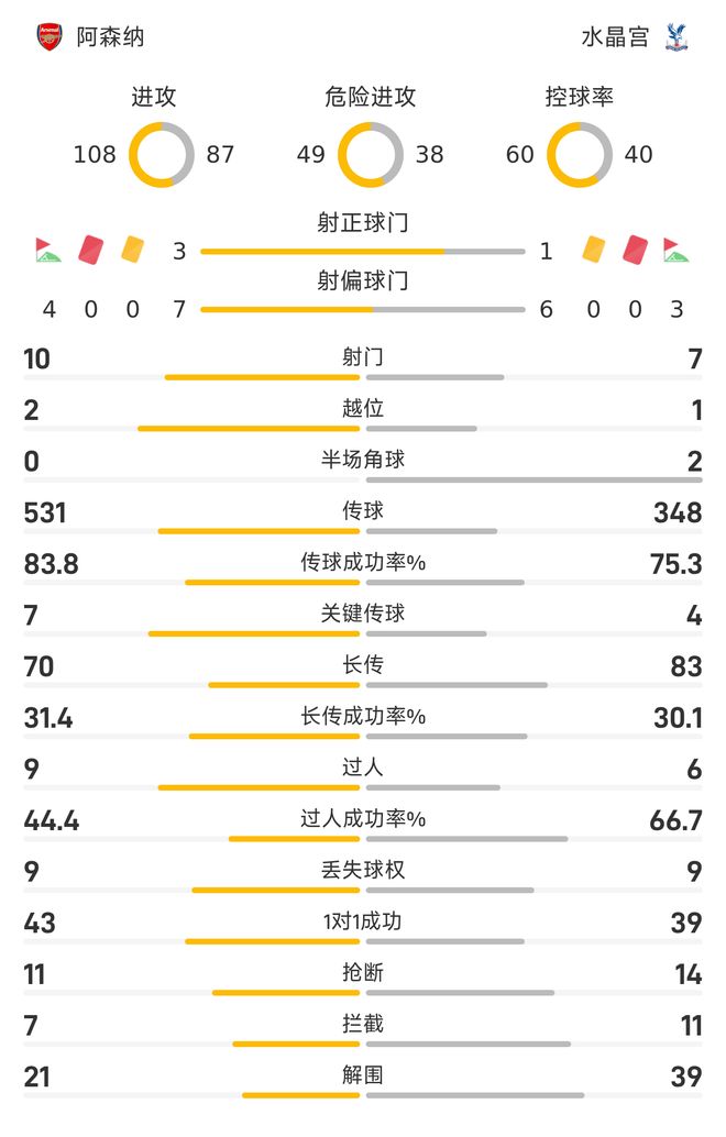 阿森纳战水晶宫全场数据:射门107,控球率60