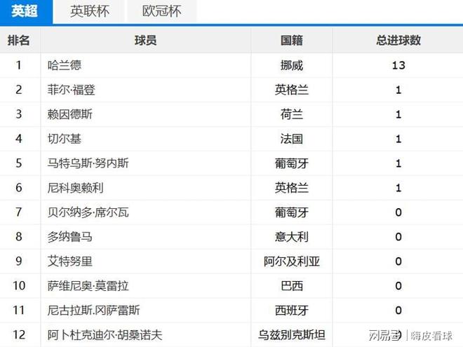 曼城的队内射手榜,哈兰德一共打进13球,随后的5名队友,都只有1个进球,一共只有6人能够进球,哈兰德足足是第二名的13倍,这个数字实在太可怕了!有些球迷可能发现了,曼城不是打进20球吗,还有2球是属于谁的呢?原来,曼城大胜升班马伯恩利的比赛中,对方后卫埃斯特夫,一人贡献两个乌龙球,从某种意义上来看,埃斯特夫才是曼城的二号射手。 显然,曼城的进球高度集中在哈兰德一个人身上,的确,超级中锋就应该有这样的表现,不仅是曼城,挪威也受益于哈兰德源源不断的进球。最近两场欧洲区预选赛,哈兰德分别打进4球和5球,两场比赛轰进9球,让净胜球落后16球的意大利,陷入彻底绝望中。因此,只要哈兰德不能进球,曼城就没有太多办法,遭遇了两场失利。