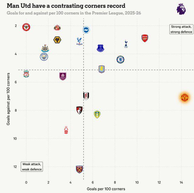 论进攻,曼联才是英超角球之王? 英超 11-10 18:02 曼联的定位球水平行不行?凭印象,你很可能得出“防守很差”的结论,这也是事实。但要是论进攻,红魔却正在成为英超的“角球之王”。上周末绝平热刺,曼联就是靠德利赫特顶进角球,而论数据,他们在某种意义上甚至强于阿森纳。据竞技网计算,曼联本赛季虽然实际角球破门数低于阿森纳、切尔西,获得角球的次数也偏低,但他们“每100次角球平均进球数”是14.3,位列全联盟第一,而“每100次角球的预期进球值”也达到了7.1,在整个英超可排第二。
