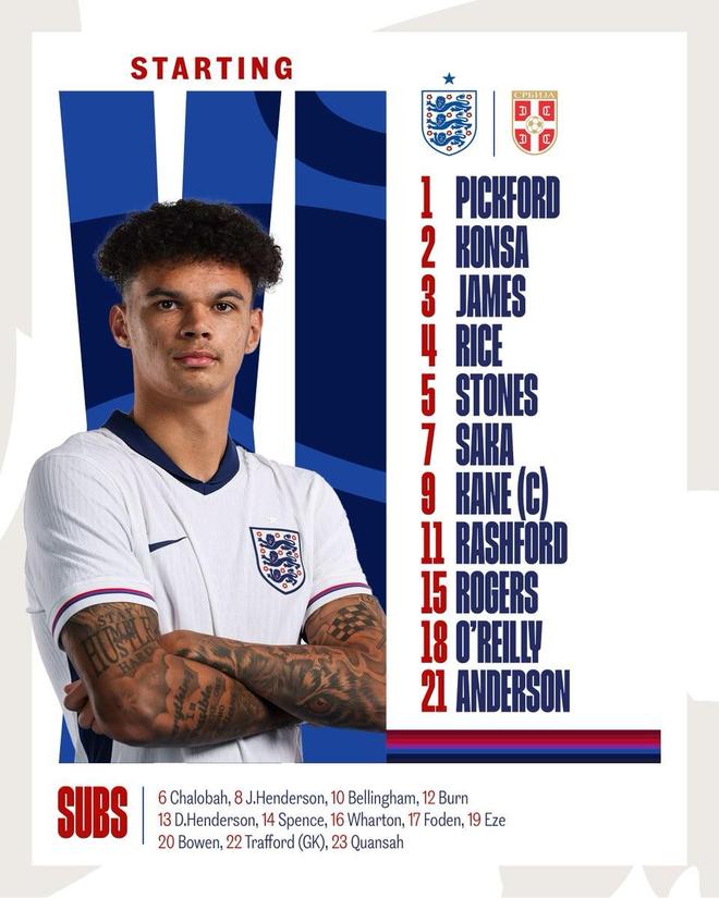 欧洲区世预赛第一阶段小组赛第9轮,英格兰队主场对阵塞尔维亚队,曼城20岁后卫尼科-奥赖利迎来英格兰成年代表队首秀。