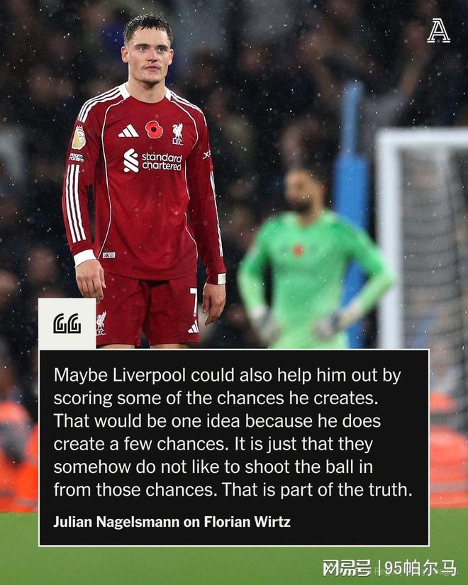 斯洛特并不觉得自己陷入了教条主义的泥潭,他用举例子的方式为自己解释,也为维尔茨减压:“他在阿隆索的勒沃库森主要踢343体系中的边锋位置,而在此之前是出任10号位。” 换而言之,暂时没有下课危机的利物浦主帅还会将信任票投给自家的7号。有意思的是,德国主帅纳格尔斯曼则用转移法为弟子打气:“维尔茨创造了一些机会,只是他的队友似乎不太愿意把这些机会转化为进球。”