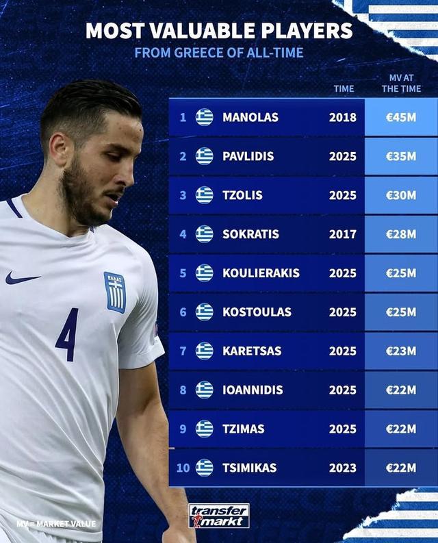德转列希腊球员历史身价前10:马诺拉斯4500万第1,帕帕上榜