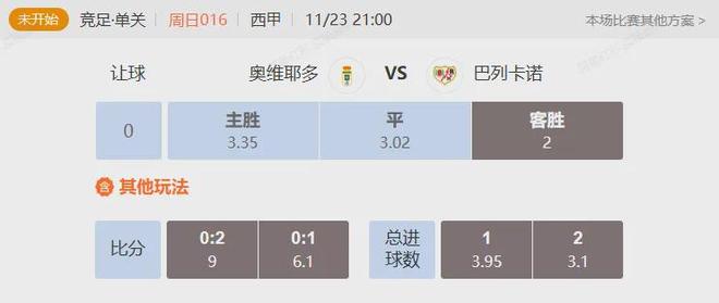 网易红彩今日挑选专家李俏洋带来一场西甲赛事解析,更多精彩方案可下载“网易红彩”App进行查阅! 1.专家:李俏洋 竞足 周日016西甲奥维耶多VS巴列卡诺 开赛时间:2025-11-23 21:00:00
