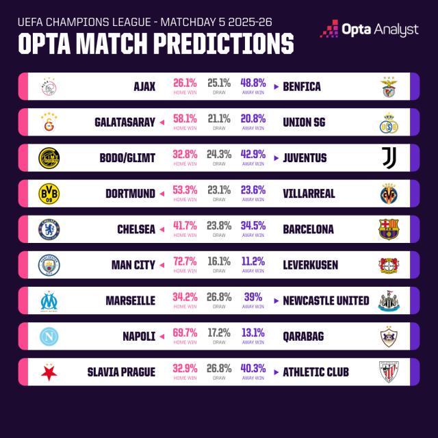 首先看一条数据:在近10次英超球队与西甲球队的欧冠碰面中,有9次都是英超球队取胜。唯一例外发生在今年9月的联赛阶段首轮,纽卡斯尔联主场1比2告负,对手恰恰就是马上要再度造访英国的巴塞罗那。而在那之后,英超球队已实现对西甲的4连胜,包括阿森纳4比0胜马竞、曼城2比0胜比利亚雷亚尔、利物浦1比0胜皇马和纽卡斯尔2比0胜毕尔巴鄂竞技。 在本赛季欧冠的6支英超参赛队伍当中,切尔西则是唯一还没有击败西甲球队纪录的(热刺曾在首轮1比0击败比利亚雷亚尔),这就让他们与巴塞罗那的相遇更显得意义特别。当然本季还没赢过西甲球队,只是因为英超蓝军之前还没遇上过,前4轮他们的对手分别是拜仁、本菲卡、阿贾克斯和卡拉巴赫,战绩2胜1平1负,积分与巴萨相同。两队排名其实也差不多,切尔西第12,巴萨第11。 再看在国内联赛的情况,凭印象你大概会觉得巴萨在西甲比切尔西在英超更强,但其实两队目前都暂列各自联赛的积分榜第二。只不过巴萨只落后榜首皇马1分,切尔西则是因为曼城突然又输球才能以6分之差排在阿森纳之后,更具体的层面还是有一点差别。如果比较两队近期战绩,国内联赛都是三连胜,上周末赢得比较轻松,而在本月初的上一轮欧冠,他们都在客场多次丢球战平了名气明显不如自己的对手。 就上述几点而言,说切尔西和巴塞罗那“半斤八两”好像并不为过。而据Opta超级计算机的模拟推演,切尔西的获胜概率为41.7%,巴萨则为34.5%,可以说主场作战的蓝军有一定的优势,但也不是很大。而从历史交锋记录来看,斯坦福桥则算不上是巴萨的福地——虽然2006年夺冠,巴萨的淘汰赛之旅正是由在蓝桥的胜利所开启,但除此之外6次欧冠做客造访这里,他们都没有获得胜利,平了2场输了4次。 在2017-18赛季的交手之后,两队已经有7年多未在正式比赛中碰面,各自变化都很大,尤其是切尔西。目前蓝军依旧缺少他们的头号球星帕尔默,但球队最大的劣势其实是欧冠经验不足,这在首轮硬碰拜仁被痛揍,以及上轮搞大轮换结果啃不下阿塞拜疆球队的比赛中都有体现。相较之下,切尔西本轮欧冠的“备战”似乎要更充分一点,因为主帅马雷斯卡终于在上周末英超实现了既轮休主力又不影响收获的目标。中场定海神针凯塞多整场都不用上,里斯·詹姆斯只踢了半场,包括加纳乔、埃斯特旺等富有冲击力的年轻攻击手也被按在替补席留力欧冠。 巴萨这边上周末4比0胜毕尔巴鄂更是赢得轻松惬意,回归诺坎普的首秀打得很响。欧冠去往客场,西甲球队的坏消息是中场佩德里来不及复出,将与加维、特尔施特根一起留在伤病名单上。但因伤缺阵已久的拉菲尼亚随队出征了,出场时间有望比上周末的替补几分钟更长。另外因病缺席了上周末联赛的拉什福德也已归队。对于英国球迷而言,这位曼联外租球员无疑非常引人瞩目,而巴萨此前之所以能客场击败纽卡,靠的也是拉什福德梅开二度。如今他和加纳乔这对前曼联“炸弹小组”成员要同场竞技,怎会不提起大家的好奇心?