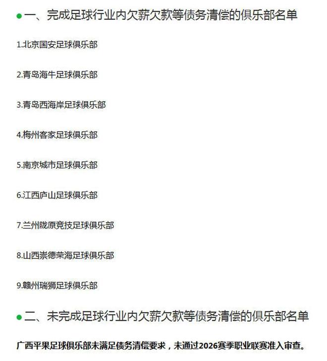 遗憾的是,这份中足联分布的欠薪欠款等债务清偿的俱乐部名单中,广西平果俱乐部仍然榜上无名,说明他们还是没能达到准入条件,未通过2026赛季职业联赛准入审查。