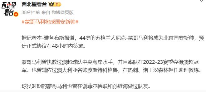 来了?真的就要来了!北京国安球迷翘首以盼的新帅即将官宣。近日,中外两边记者纷纷爆料,44岁的苏格兰教练尼克-蒙哥马利将成为北京国安新帅。据西北望看台报道(下图),记者本-雅各布斯透露的最新消息称,预计最近48小时内蒙哥马利将跟北京国安签下执教合同。