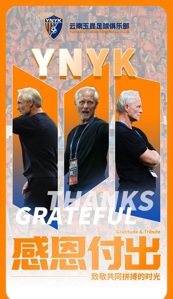 今天下午,云南玉昆在俱乐部官方社交账号上发布公告,称出于球队发展考虑,经友好协商,主教练约恩-安德森及其教练团队合同到期后不再续约。 安德森自2024年6月上任云南玉昆,帮助球队以中甲冠军的身份成功冲超。队史首个中超赛季,安德森率队取得11胜9平10负的战绩,最终排在上个赛季中超联赛第8。执教云南玉昆期间,安德森总计带队参加53场比赛,取得26胜12平15负的成绩。