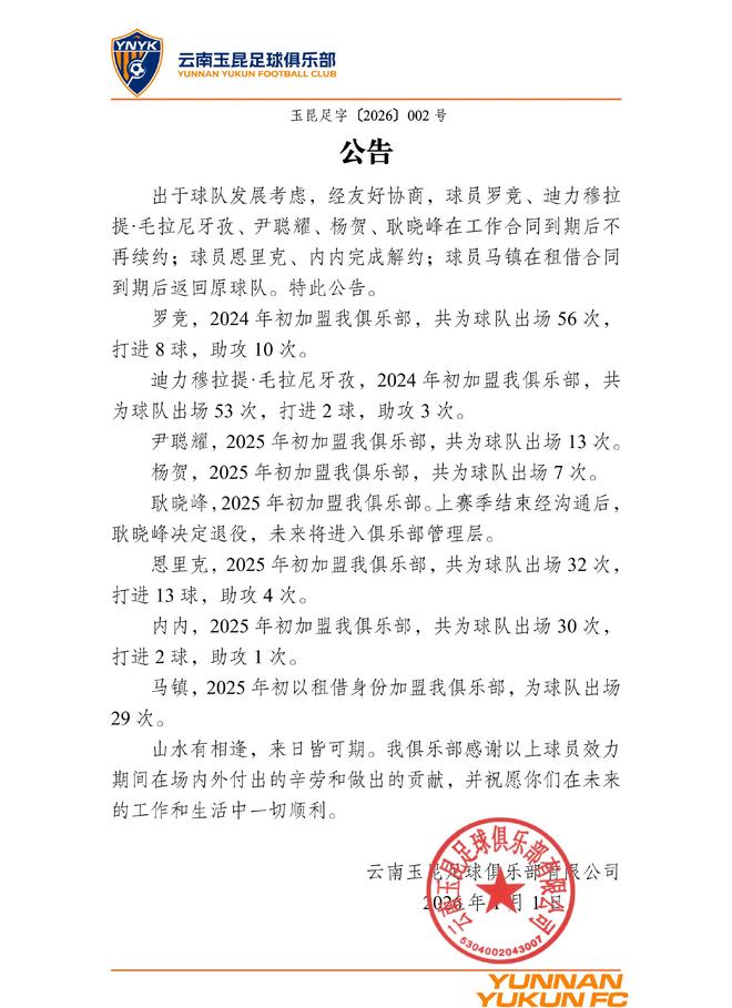 北京时间1月1日,中超联赛最新动态,上赛季取得联赛第8名的云南玉昆官宣,主教练合同到期后离任,同时8名球员离队,而球队新任主教练则早已敲定。