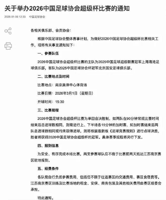 上海海港2026年的首个锦标争夺战时间确定! 中国足协今天在官网发布通知:2026中国足协超级杯比赛将于年3月1日(星期日)15:30开球,比赛地点为南京奥体中心体育场。对阵双方为上海海港(2025中超冠军)与北京国安(2025中国足协杯冠军)。 |