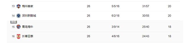25赛季中超26轮赛程过后,排在积分榜最后四位的球队是长春亚泰、青岛海牛、深圳新鹏城、梅州客家。