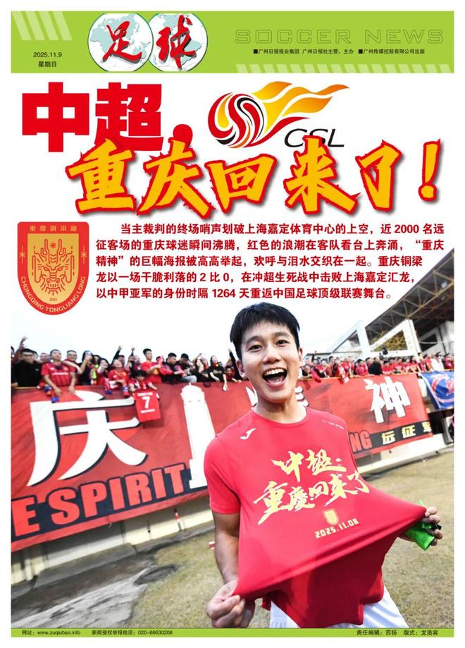 但这样的小口误,其实也可以有另一种解读。40岁的老将黄希扬在这一天再次落泪,像4年前在重庆两江竞技俱乐部电梯口告别,听着球迷的一声声“雄起”时一样情不自已——那声“中超,还给你们了”的嘶吼,是他兑现对重庆球迷承诺后的释放;那句“剩下的,交给他们了”则是他同所有重庆球迷一样对于铜梁龙年轻一代的无限期许。 正是一代一代的重庆足球人持续不断地坚守,打造了重庆足球的魂。 当铜梁龙的队徽出现在下赛季中超赛场,这不仅是一支球队的胜利,更是一座城市足球信仰的延续。从两江竞技解散的阴霾,到铜梁龙的浴火重生,重庆足球在等待中积蓄力量,在挫折中砥砺前行。 正如那些远征客场的球迷所说:“我们从未离开,因为足球早已融入这座城市的血脉。”下赛季的中超赛场,重庆铜梁龙将带着这份荣耀与坚守,继续书写属于山城的足球传奇。
