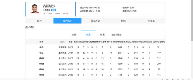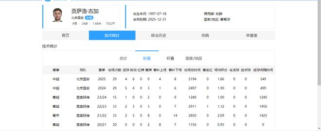 在签约费高,且技术特点不明显,同位置的外援达万也能起到一样作用的情况下,古加自然不具备性价比。 截止中超29轮,古加共代表国安出场29次,累计打进4球,送出6记助攻。