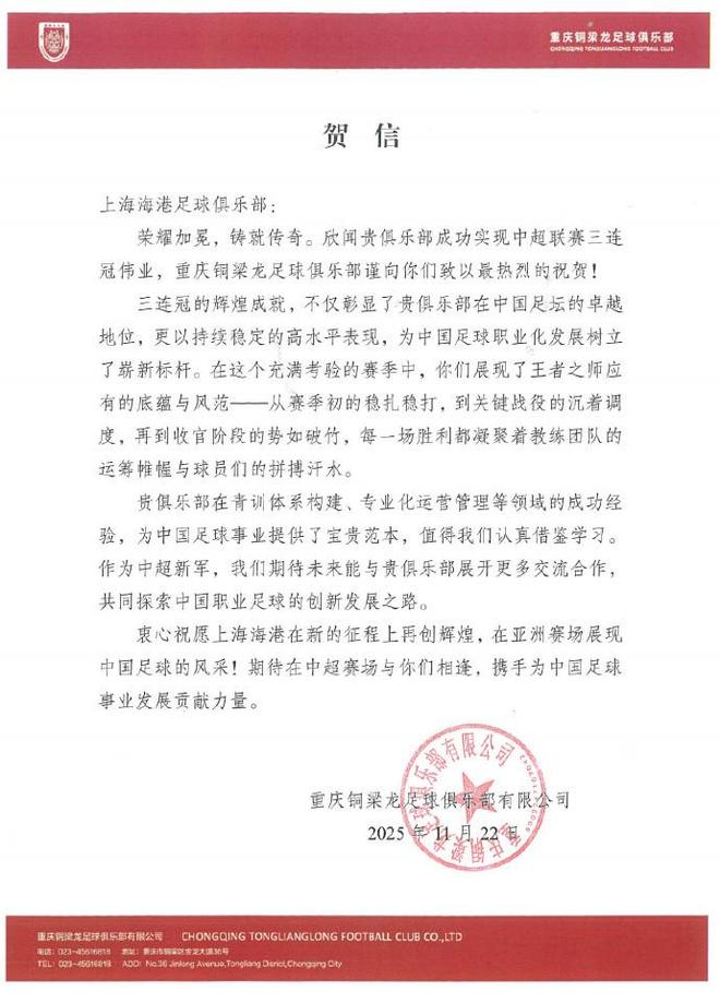 上海海港足球俱乐部: 荣耀加冕,铸就传奇。欣闻贵俱乐部成功实现中超联赛三连冠伟业,重庆铜梁龙足球俱乐部谨向你们致以最热烈的祝贺! 三连冠的辉煌成就,不仅彰显了贵俱乐部在中国足坛的卓越地位,更以持续稳定的高水平表现,为中国足球职业化发展树立了崭新标杆。在这个充满考验的赛季中,你们展现了王者之师应有的底蕴与风范 —— 从赛季初的稳扎稳打,到关键战役的沉着调度,再到收官阶段的势如破竹,每一场胜利都凝聚着教练团队的运筹帷幄与球员们的拼搏汗水。 贵俱乐部在青训体系构建、专业化运营管理等领域的成功经验,为中国足球事业提供了宝贵范本,值得我们认真借鉴学习。作为中超新军,我们期待未来能与贵俱乐部展开更多交流合作,共同探索中国职业足球的创新发展之路。 衷心祝愿上海海港在新的征程上再创辉煌,在亚洲赛场展现中国足球的风采!期待在中超赛场与你们相逢,携手为中国足球事业发展贡献力量。 重庆铜梁龙足球俱乐部有限公司 2025年11月22日 |